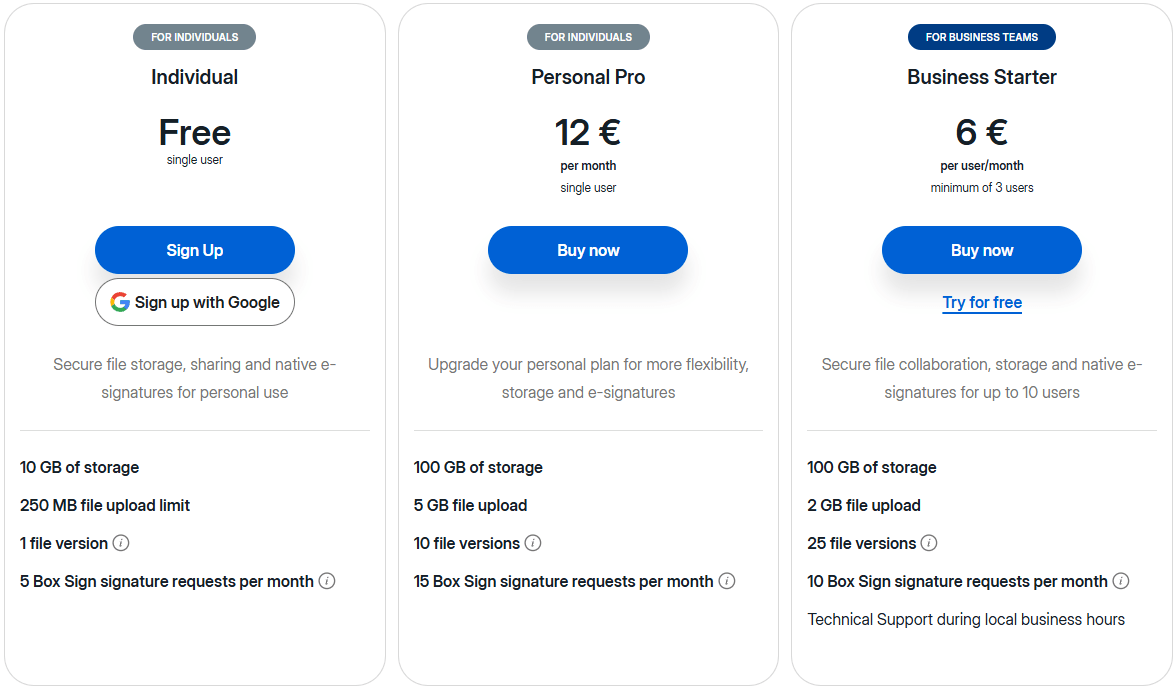 Ceny služeb Boxu také odrážejí skutečnost, že služba Boxu je nejvíce orientována na podniky, kterým při pohledu na ceník doslova vychází vstříc. Ceny pro jednotlivce jsou podle našeho názoru nevýhodné. Při měsíčních cenách 6 € (147 Kč) nebo 12 € (294 Kč) měsíčně získat pouze 100 GB je již velmi podhodnocené s dnešní konkurencí, která nabízí podobné velikosti za 2 € (49 Kč) měsíčně. Je pravda, že pokud se rozhodnete platit ročně, dosáhnete úspory až 25 %. Ale částka je zde podle našeho názoru stále nepřiměřená. Proto doporučujeme využít jednu z výhod a začít s bezplatným účtem (free account) na 14 dní, který nabízí 10 GB. Po registraci můžete dokonce získat slevu na následující 2 měsíce.