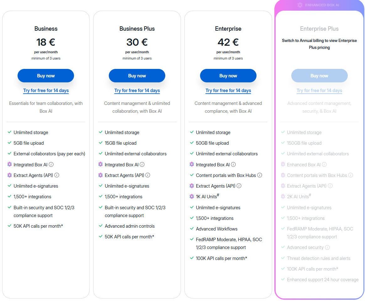 Jinak je to s firemní účty (obchodní plány), kde Box nabízí „neomezené úložiště“ již od 18 € (441 Kč) měsíčně. Nabídka firemních účtů je široká a s cenou roste i maximální velikost souborů, které můžete nahrát. Samozřejmě nic nebrání tomu, aby si individuální uživatel zaplatil firemní účet, který se z hlediska velikosti úložiště vyplatí více. Stejně jako u cen pro jednotlivce je i u firemních tarifů možnost roční platby s úsporou 25 procent oproti běžné měsíční platbě.